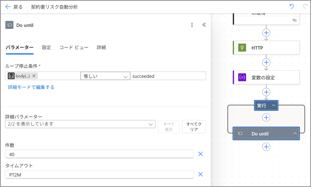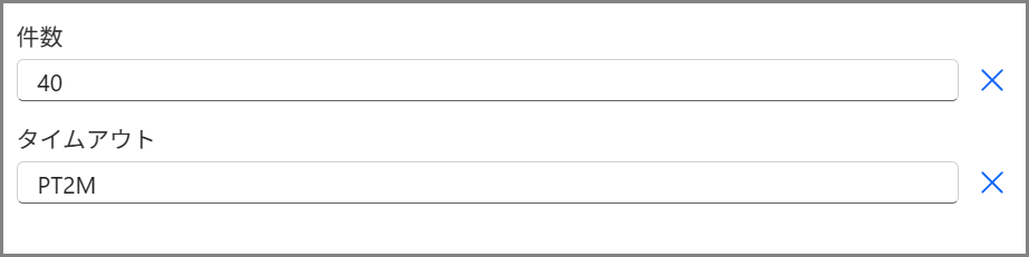 詳細パラメーターの中に「件数」、「タイムアウト」の項目があるので設定します。