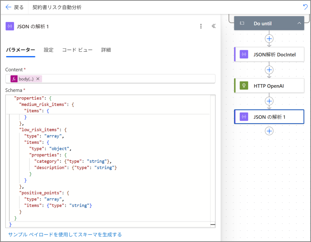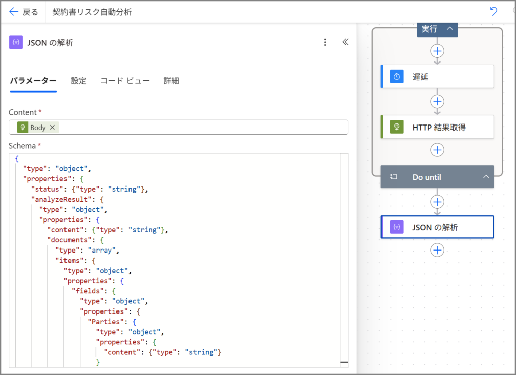 @{body('JSON解析_DocIntel')?['analyzeResult']?['content']} で契約書のテキストを取り出してるんです。