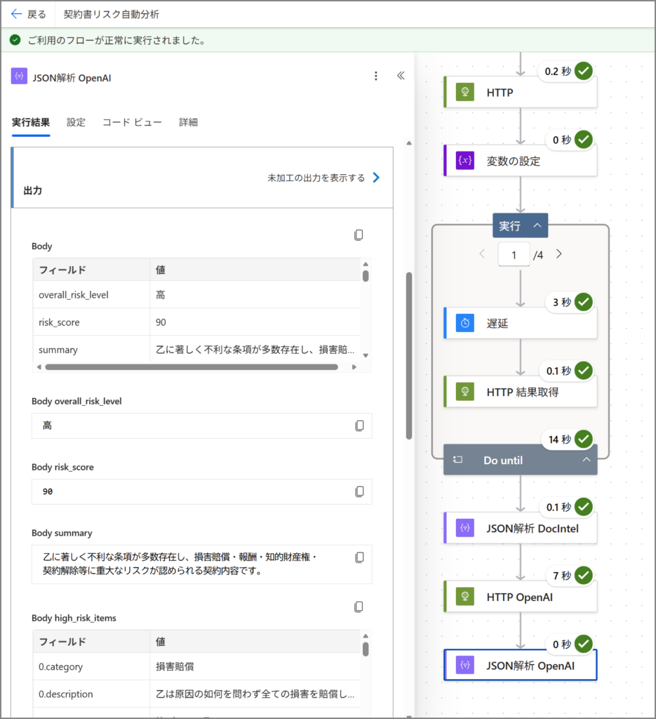 「JSON解析_OpenAI」のアクションを開くと、AIが分析した結果が見えるはずです。