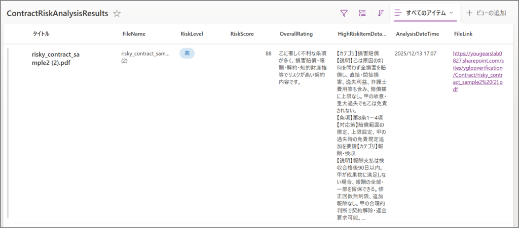 | リスト名 | ContractRiskAnalysisResults(第1回で作成したリスト) |