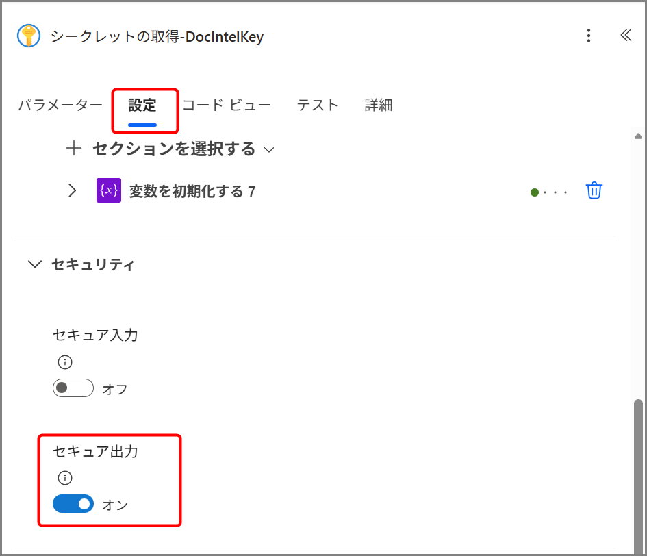 - HTTPアクションもセキュリティで「セキュア入力」「セキュア出力」をオンにする