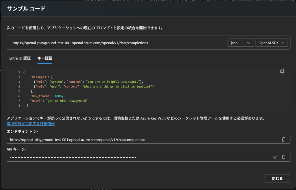 - エンドポイント: あなたのAzure OpenAIリソースのURL
