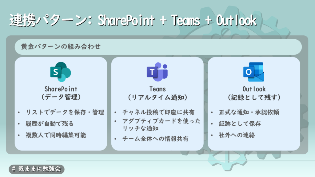 システム連携において、僕が最も重要だと考えているのが「SharePoint + Teams + Outlook」の黄金パターンです。