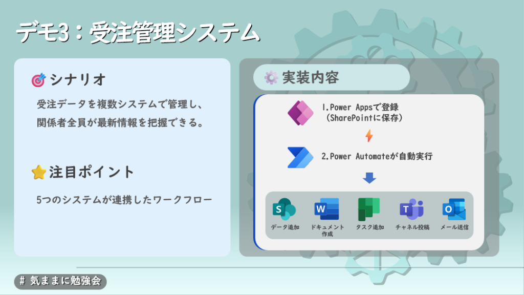 前回の勉強会では基礎的な連携方法についてお話ししたんですが、今回はもう一歩踏み込んで、SharePoint、Teams、Outlookなど複数のMicrosoft 365ツールを組み合わせた、より実践的な業務自動化についてお話ししました。
