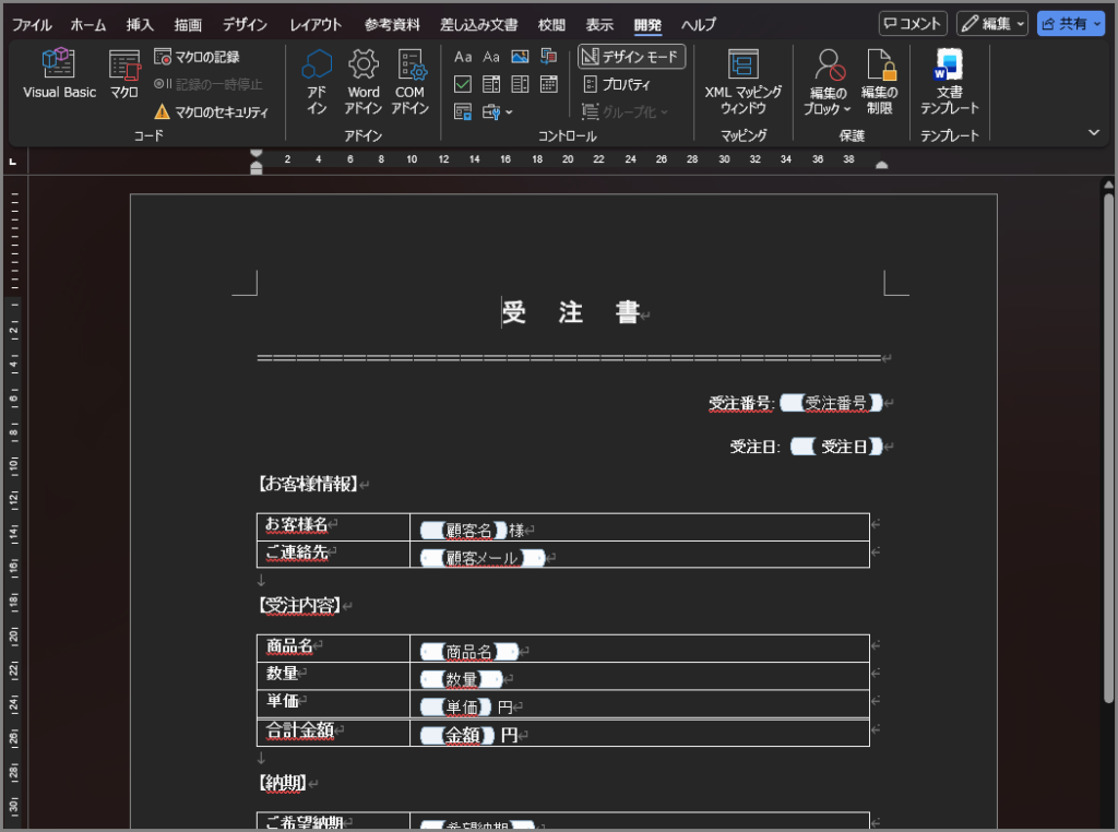 まず、Wordでテンプレートを作成する際に、差し込みたい部分に「コンテンツコントロール」を配置します。