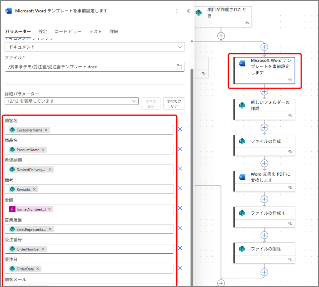 「Populate a Microsoft Word template」アクションを使えば、SharePointのデータが自動的に該当箇所に挿入されるんですよ。