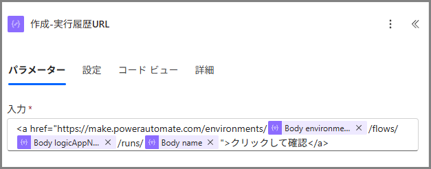 <a href="https://make.powerautomate.com/environments/@{body('JSON_の解析')?['tags']?['environmentName']}/flows/@{body('JSON_の解析')?['tags']?['logicAppName']}/runs/@{body('JSON_の解析')?['run']?['name']}">クリックして確認</a>