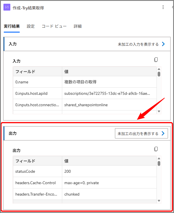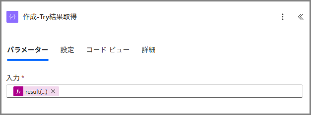 - 「開始」に、先ほどの「Try結果取得」の出力を選択する