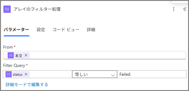 そこで、「アレイのフィルター処理」を使って、失敗したアクションだけを抜き出します。