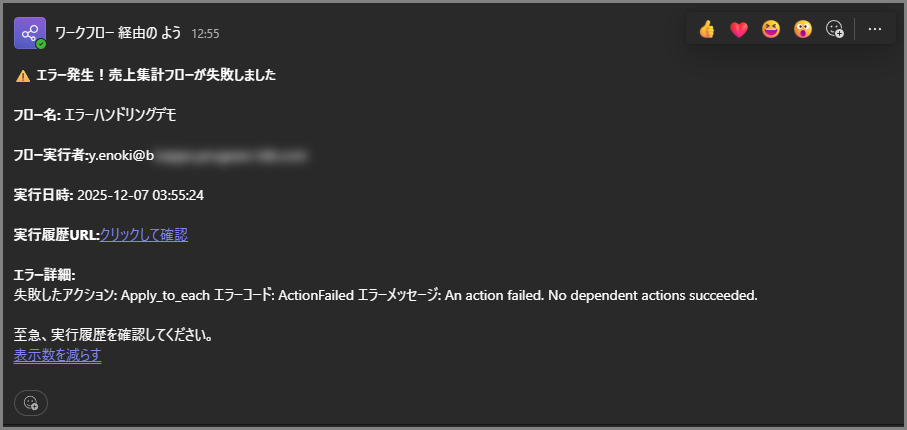 エラーが起きたアクション名とメッセージがあれば、実行履歴を開く前に原因の見当がつきます。